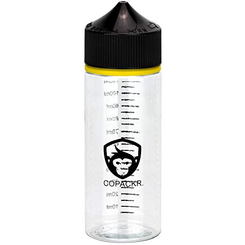 Copackr 4 flaconi contagocce da 120 ml V3 - Chubby Gorilla, in plastica PET con misurazione per olio, liquido, inchiostro e prodotti chimici - perfetti per i viaggi - Con tappi a prova di bambino