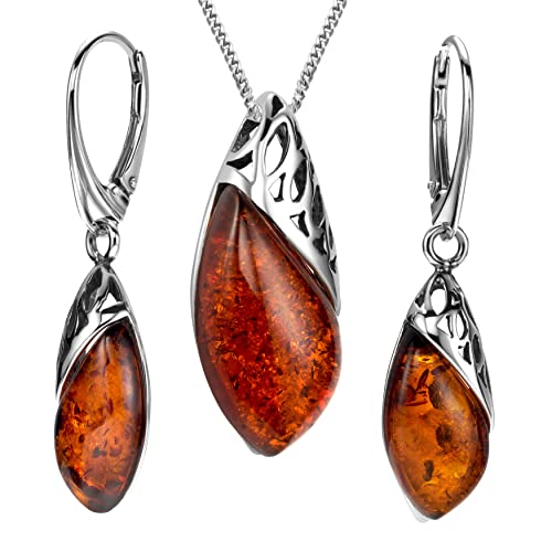 CIONDOLO: Elegante ciondolo in ambra. Dimensioni ciondolo: 23 x 10 mm. ORECCHINI: orecchini in argento sterling con marchio 925, ambra, 23 x 10 mm, a monachella.