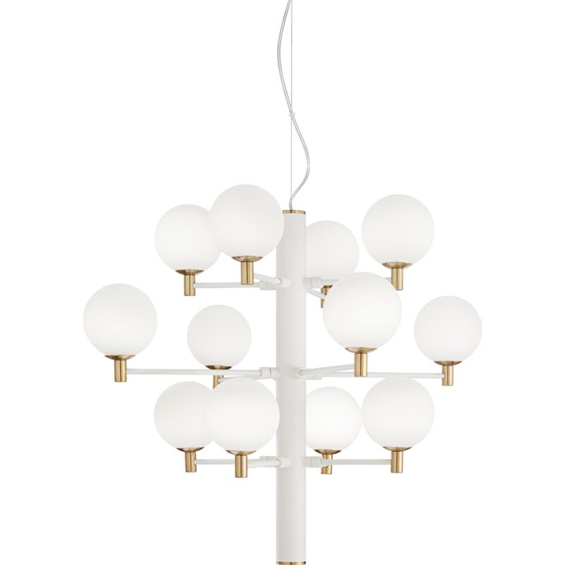 Montatura in metallo verniciato bianco o nero opaco con dettagli in ottone. Diffusori in vetro incamiciato bianco soffiato e acidato. Ø 71 x H min 84 / max 172,5 cm G9 max 12 x 40W IP:20