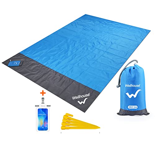 Grande coperta da picnic per wellhouse spiaggia dimensioni 210 x 200 cm (XL), il tappetino da campeggio oversize si adatta a 4-6 adulti Ha bordi rinforzati e 4 chiodi fissi professionali per più forte e migliore da usare, quando ti piace il tappetino da spiaggia all'aperto, pausa vento.