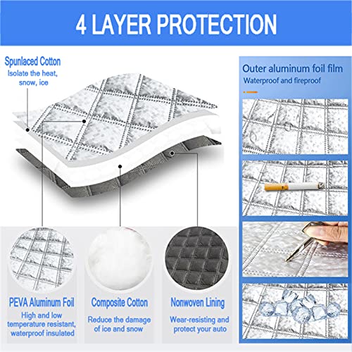 MATERIALE AGGIORNATO: La nostra copertura per parabrezza dell'auto ha quattro strati che contengono un foglio di alluminio PEVA, cotone composito, cotone spunlaced e materiale non tessuto. Materiale ultra spesso, rivestimento in alluminio su entrambi i lati, resistente alla temperatura, resistente allo strappo, durevole.