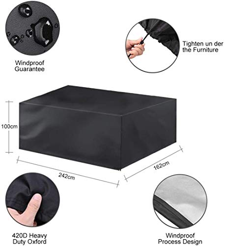 Ampia compatibilità: verifica che la dimensione del mobile sia adeguata. Suggerimento: quando si utilizza una copertura per mobili, si consiglia di riempire l'altezza media per drenare rapidamente l'acqua piovana, ottenere una migliore resistenza all'acqua e prolungare la durata della copertura per mobili. Se c'è un forte vento, appoggiaci sopra oggetti pesanti per evitare che cada.