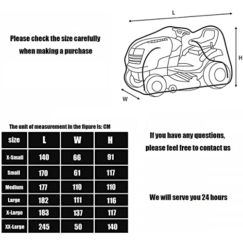 [Dimensioni]: la copertura per tosaerba è disponibile in 6 misure.Questa copertura per tosaerba è universale.La resistente copertura in tessuto è progettata per adattarsi alla maggior parte dei trattorini standard.Si prega di controllare le dimensioni del tosaerba prima di effettuare un ordine.