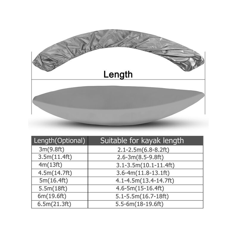 Il Kayak di immagazzinaggio della copertura è per tutti coloro che vogliono mantenere la loro kayak pulito.Caratteristiche:Resistente AI RAGGI UV, impermeabile e anti-polvere.Rotolo e chiusura a clip è regolabile per il kayak.Facile da usare, senza la necessità di altri strumenti.Fornire grande protezione per il vostro kayak sulla spiaggia o nel cortile di casa.Specifiche tecniche:Materiale: panno di OxfordColore: Grigio/Nero (Facoltativo) Dettagli:Lunghezza (Opzionale)Adatto per kayak lunghezza3.0m / 9.8ft2.1-2.5m / 6.8-8.2ft3.5m / 11.4ft2.6-3.0m / 8.5-9.8ft4.0m / 13.1ft3.1-3.5m / 10.7-11.4ft4.5m / 14.7ft3.6-4m / 11.8-13.1ft5.0m / 16.4ft4.1-4.5m / 13.4-14.7ft5.5m / 18.0ft4.6-5m / 15.0-18.0ft6.0m / 19.6ft5.1-5.5m / 16.7-18.0ft6.5m / 21.3ft5.6-6m / 18.3-19.6ft Cornici E Articoli Da Esposizione Lista:1 x Copertura di Kayak1 x sacchetto di ImmagazzinaggioNota: Si Prega di leggere la tabella di formato per comprare il prodotto di la lunghezza che avete bisogno. La lunghezza sulla foto in