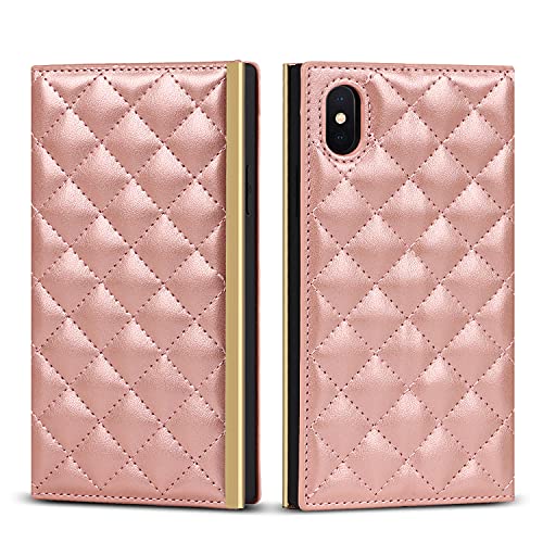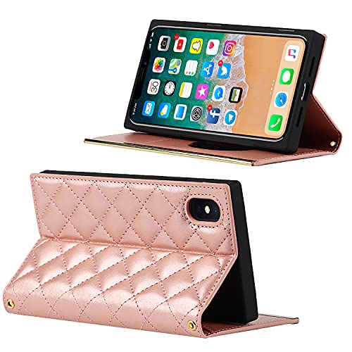 Copmob Cover con Cordino iPhone X/XS,Flip Portafoglio Custodia in Pelle,[1 Slot][Specchio][con Laccio],Custodia Libro Cover per iPhone X/XS - Oro Rosa