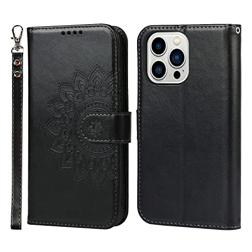 Copmob Cover iPhone 14 PRO con Cordino,Flip Fiori Portafoglio Custodia in Pelle,[4 Porta Carte][Supporto Stand][Magnetica],Custodia Cover Libro per iPhone 14 PRO - Nero