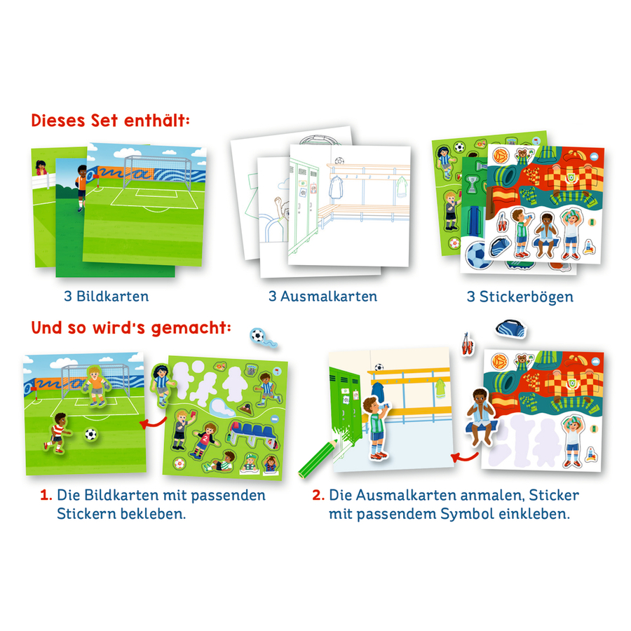 Dettagli del prodotto: Età: da 4 anni Per tutti i bambini che amano colorare e attaccare gli adesivi: Questo set illustrato con amore contiene 3 carte illustrate colorate, 3 carte da colorare e 3 fogli di adesivi con oltre 40 adesivi di calcio. Dimensioni e peso: Dimensioni della copertina in cartone (lunghezza x larghezza x altezza): 15 x 15 x 0,5 cm Dimensioni del foglio di adesivi (lunghezza x larghezza): 14,5 x 14,5 cm Dimensioni del cartoncino (lunghezza x larghezza): 14,5 x 14,5 cm Peso: 0,07 kg Materiale e cura: Materiale: Carta Incluso nella consegna: 1 x busta di cartone con perforazione Euro 3 x fogli di adesivi 6 x carte Avvertenze e istruzioni di sicurezza: Attenzione: non adatto a bambini di età inferiore a 36 mesi. Pericolo di soffocamento a causa delle piccole parti.