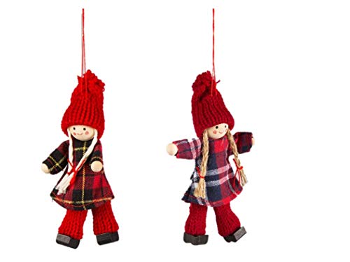 Coppia di bambole natalizie in feltro tartan e lana rossa da appendere