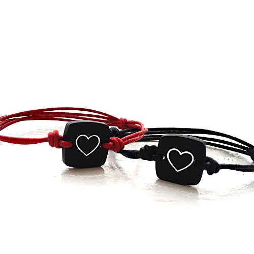 Coppia braccialetti con ciondolo in alluminio anodizzato (nero opaco) con cuore inciso. Cordino in cotone cerato. Idea regalo San Valentino