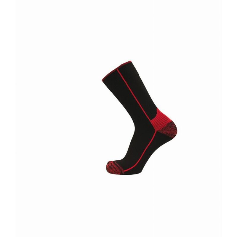 Dettagli: Coppia di calzini in Coolmax. Talloni e punte rinforzati in cordura. Marcatura della taglia sulla suola. Caratteristiche: Composizione: 73% COOLMAX + 15% poliammide 6% elastan 3% cordura. Colore: NERO/ROSSO. Nero e rosso46/48