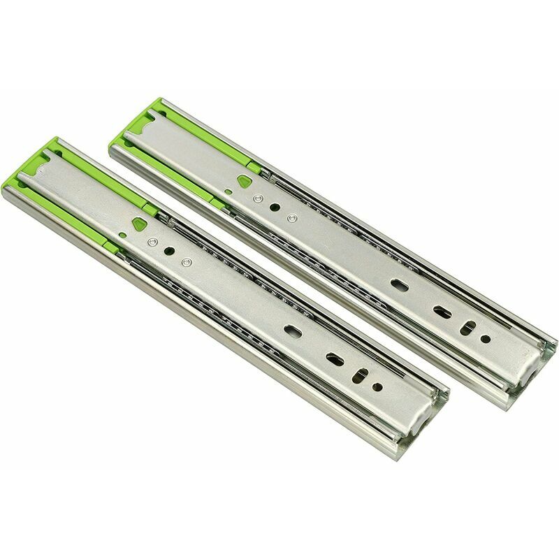 Caratteristiche - La guida del cassetto consente l'estensione completa evitando la caduta del cassetto, senza compromettere l'estetica del mobile. Le nostre guide complete sono dotate di uno speciale meccanismo di ritardo che consente la chiusura silenziosa del cassetto. Il sistema Soft Closing impedisce anche l'apertura automatica, quindi non c'è il rischio che gli oggetti riposti cadano. Uso duraturo - Il kit include 2 guide che si adattano al lato destro e al lato sinistro del cassetto . Il cassetto scorrevole è realizzato in acciaio zincato, che lo rende altamente resistente all'umidità, non si deforma sotto il peso del cassetto e riduce i movimenti laterali, garantendo così un utilizzo sicuro. Universalità - Il meccanismo di scorrimento del cassetto Le guide telescopiche si basano su cuscinetti a sfera che si muovono su guide profilate. Il nostro rullo scorrevole ha una struttura telescopica progettata per un carico massimo di 35 kg. Le guide per cassetti sono estremamente facili