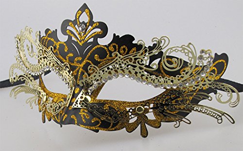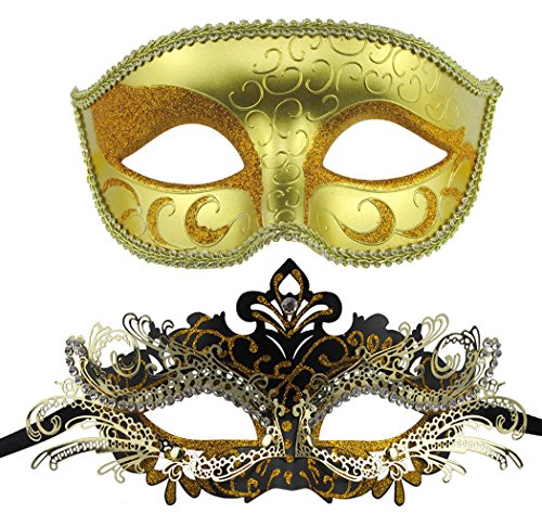 Coppia di maschere veneziane in metallo e in plastica, per carnevale e Halloween Gold+Black-Gold