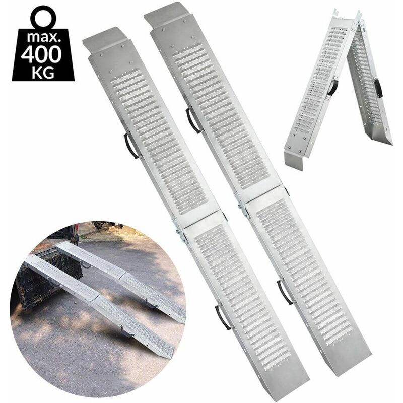 Con la nuova coppia di rampe di carico pieghevoli potrai caricare e scaricare da camion e auto tutto quello che vorrai con il massimo della facilità! Ogni rampa è realizzata interamente in lamiera di acciaio galvanizzato, materiale molto resistente, infatti ogni rampa può sopportare un carico massimo di 200kg per un carico totale di ben 400kg, Fornita di estremità di appoggio inclinata per evitare che il veicolo scivoli durante la guida e di una particolare foratura zigrinata che ricopre interamente le rampe che rendono quest'ultime completamente antiscivolo per un eccellente livello di sicurezza durante il loro utilizzo. Ma ciò che rende d'avvero particolari questa coppia di rampe di carico è la loro struttura pieghevole e salvaspazio, infatti una volta finito il loro utilizzo possono essere ripiegate e riposte anche in piccoli spazi, inoltre grazie ai pratici manici presenti su ogni rampa sono facili da trasportare. Leggere e robuste ideali per l'uso quotidiano, queste rampe dalle