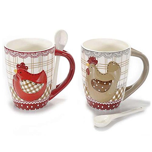 Coppia di tazze in ceramica con cucchiaino e docoro gallina in rilievo country.