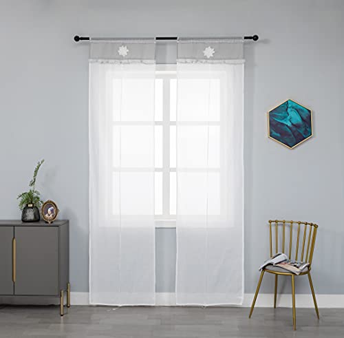 Coppia Tende Bianche Semi Trasparenti con Fiore di Loto e Orlo Superiore Grigio Tenda per Porta Balcone Finestra Soggiorno Camera e Cameretta 2 Pannelli con Tasca (Grigio, 60x240cm)