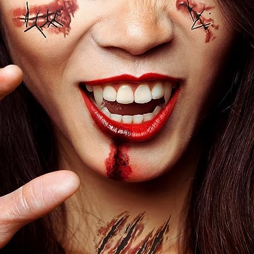 3 coppie di denti finti da vampiro (dimensioni: 13 mm, 15 mm e 17 mm) e 3 adesivi con cicatrici sfregiate, accessori per il ruolo di ruolo, sono molto adatti per il ruolo a tema di ruolo di Halloween