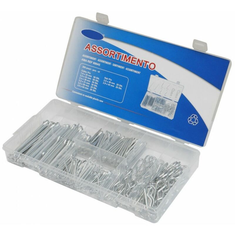 In acciaio zincato, in cassetta. COMPOSIZIONE: - 50 coppiglie mm. 1,6x25 - 50 coppiglie mm. 2,4x25 - 50 coppiglie mm. 2,4x38 - 30 coppiglie mm. 3,2x31 - 20 coppiglie mm. 3,2x50 - 20 coppiglie mm. 4x64 - 20 coppiglie a molla mm. 2x40 - 20 coppiglie a molla mm. 2,8x42 cod. 40377 cf/cf 1