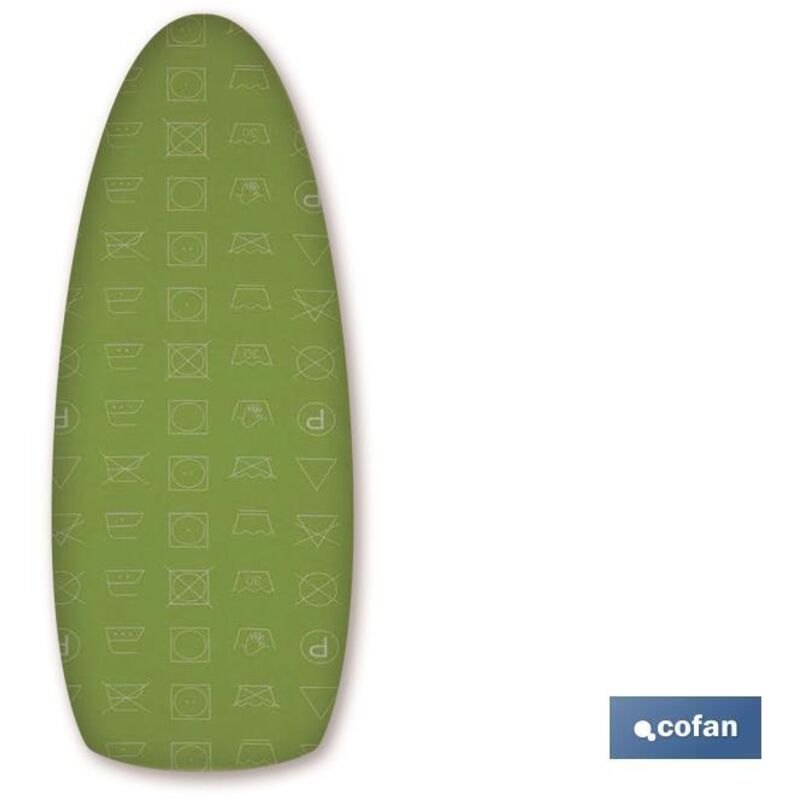 Copriasse da stiro universale con stampa icona lavaggio bianca su sfondo verde. Tessuto in cotone di ottima qualità e imbottitura resistente al calore che garantisce una stiratura fluida. Hanno diverse stampe moderne ed eleganti. Le sue misure massime