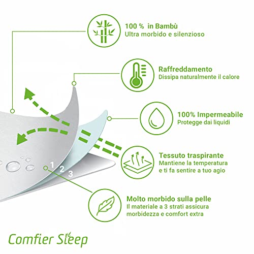 SUPERFICIE MORBIDA E SILENCZIOSA - Jersey 100% in fibra di bambù molto morbido e liscio, impedisce praticamente qualsiasi rumore. Scivola facilmente sul il tuo cuscino e assorbe l'umidità. Lo speciale design degli angoli permette all'area di uscire dalla protezione, rendendola ancora più traspirante.