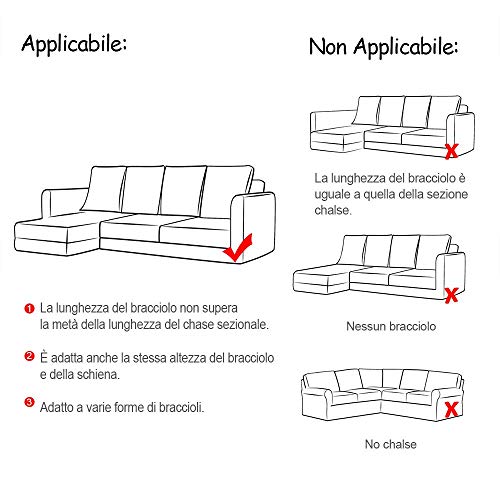 1 x manuale utente (lingua italiana non garantita). Questo copridivano è adatto per un divano ad angolo a L composto da una parte principale e da una meridiana. Se si dispone di un divano non modulabile, questa fodera non è adatta. Per scoprire se questo copridivano a forma di L è adatto al tuo divano, consulta la nostra tabella delle taglie.
