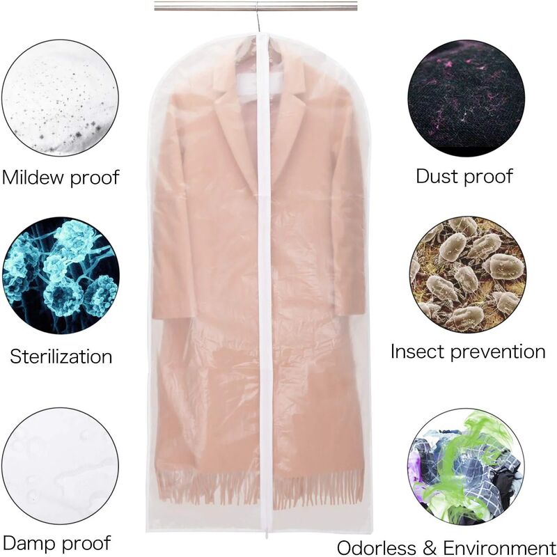 Pacco conveniente: 6 fodere per cappotti, 6 delle quali 60 x 140 cm( La taglia normale senza vestiti, c'è un errore di 1 cm), la taglia è adatta i tuoi vestiti, le suite, i cappotti, i maglioni e altro, specialmente la tua borsa porta abiti lunga. vestiti adatti alla larghezza e alla lunghezza dei tuoi vestiti, è perfetto per tutte le tue esigenze di conservazione e di viaggio. Traspirante e traslucido: fatto di Realizzati in materiale PEVA di alta qualità, sono leggeri ma facili da imballare. usura, morbido e setoso, traspirante e inodore, perfetto per riporre i vestiti di stagione. Borsa porta abiti traslucida Sapere cosa c'è dentro all'interno delle borse per abiti all'istante, puoi trovare facilmente i vestiti. Coperture protettive: le fodere per indumenti Niviy possono proteggere gli indumenti da polvere e muffa, incrostazioni, peli di animali domestici, antitarme, prevenire lo sbiadimento degli indumenti, la copertura resistente all'umidità, la deformazione e l'ingiallimento