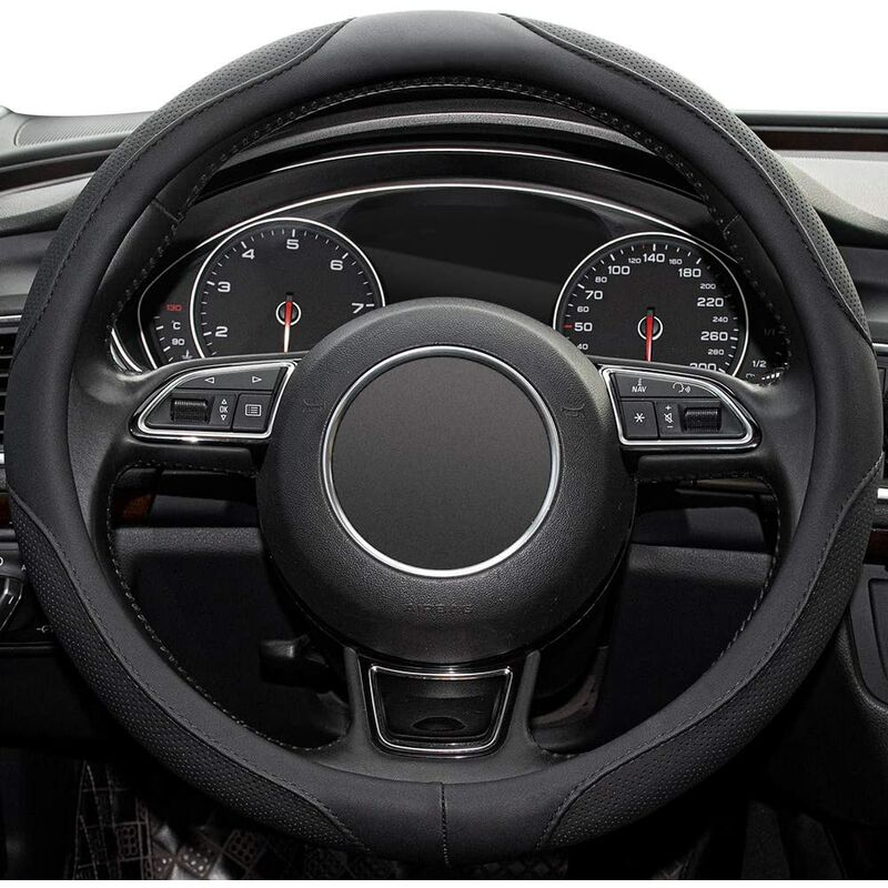 Taglia adatta: Adatto a tutti i volanti di medie dimensioni con un diametro da 14 1/2 pollici a 15 pollici (da 37 cm a 39 cm). Scorta la tua sicurezza: La superficie del coprivolante ha un design della linea antiscivolo, che può aumentare l'attrito tra il palmo e il coprivolante. Può controllare meglio la direzione anche durante la guida su strade sconnesse. L'anello interno bianco appositamente progettato può assorbire le vibrazioni e fornire una presa migliore. Proteggerà ed eviterà di stimolare il tuo cuore quando l'auto scuote violentemente il veicolo. Salute e qualità premium: Il rivestimento del volante è realizzato in pelle microfibra esterna e interna in gomma naturale, sano ed ecologico, ti offre un tocco e una sensazione eccezionali. Il design del foro di respirazione sulla superficie può evitare la generazione di sporco e batteri. Installazione semplice: Puoi riscaldare il copriruota dell'auto al sole o con un asciugacapelli, posizionare il copriruota sulla parte superiore
