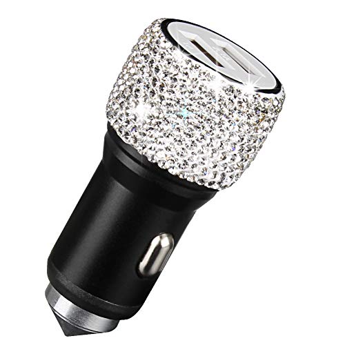 Caratteristiche del caricatore USB per auto: adattatore per caricatore per auto a 2 porte USB adatto per iOS e Android, ricarica rapida in uscita 2.1A. E tempestato di centinaia di strass di cristallo splendente, squisito arredamento per auto. & Design del martello di sicurezza: speciale punta in acciaio inossidabile come un martello di emergenza, in grado di rompere i finestrini dell'auto in caso di emergenza. Regalo perfetto per te