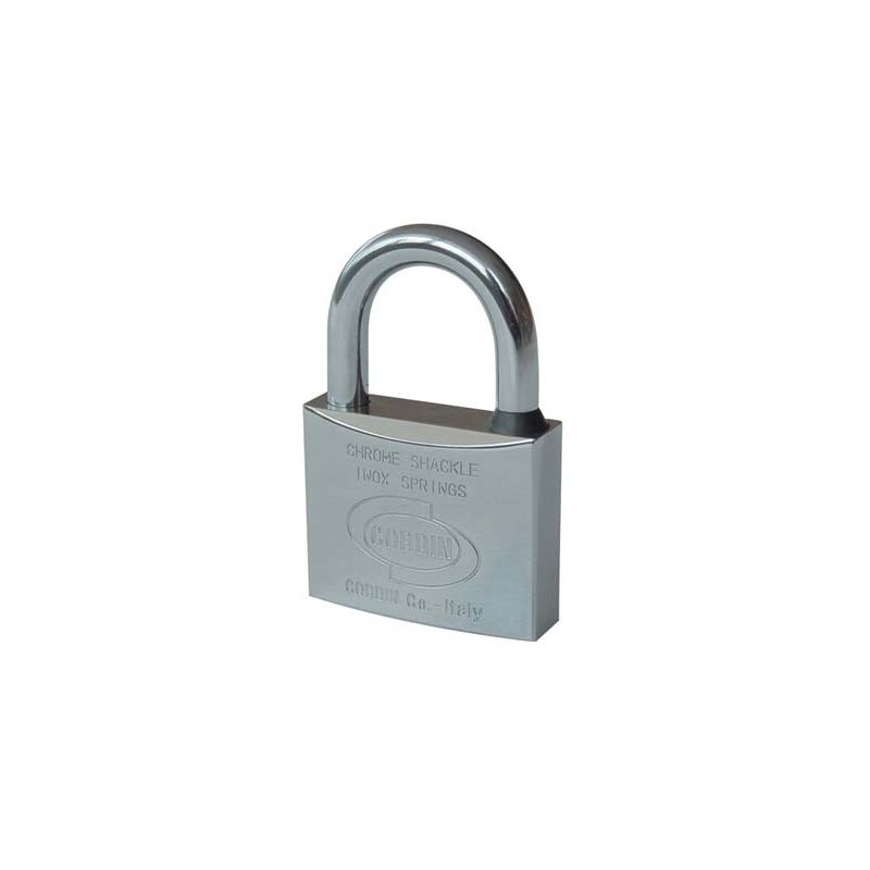Corpo in ottone cromato ed arco in acciaio cromato. Fornito con 2 chiavi piatte.