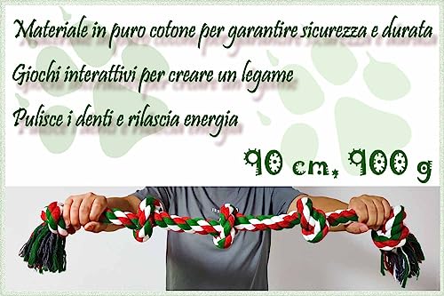 PROGETTATO PER I CANI DI TAGLIA GRANDE: Questo giocattolo da dentizione in corda è stato progettato per i cani di taglia grande, sia che si tratti di una razza di taglia grande o di una razza con un morso potente. Con una lunghezza di 90 cm e un peso di 900 g, la corda di cotone a 5 nodi è stata ideata per essere compatibile con la struttura e la forza della bocca dei cani di taglia grande, soddisfacendo il loro desiderio di masticare e liberare energia.