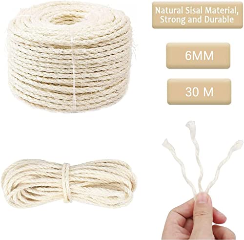 Corda in sisal per tiragraffi, 30 m, corda in sisal naturale, per albero di gatto, corda di canapa naturale, adatta per accessori per gatti, decorazione di case (6 mm - 30 m, sisal)