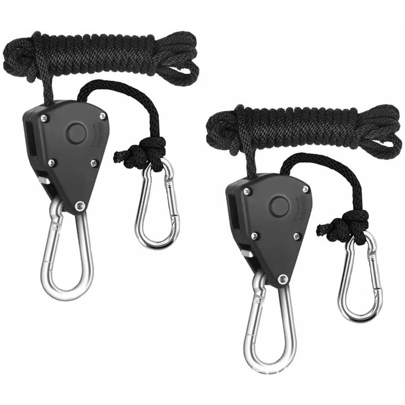 1 paio di corde con ganci : La confezione include 2 corde a cricchetto, ogni corda è lunga circa 200 cm. Capacità di carico : Il carico massimo è di 30 kg, design regolabile, ideale per essere appeso molti articoli come lampade, ventilatori sospesi, piante decorative, ecc. Materiale di qualità : Realizzato in materiale di alta qualità, PPC + corda di nylon + puleggia in metallo + fibbia in alluminio, che fornisce resistenza e durata in modo efficace. Facile da usare : La lunghezza regolabile e il design di bloccaggio migliorano la praticità. Basta attaccare il gancio in un luogo robusto, quindi collegare l'altra estremità all'oggetto da appendere e regolare la corda all'altezza desiderata. Ampie applicazioni : Gli ordini con ganci sono disponibili in luci, ventilatori, ventilazione sistemi, filtri, riflettori, ecc. davvero utile nella tua vita quotidiana. 1 Paio di Corda con Ganci per Lampada a Sospensione o Piante Descrizioni
