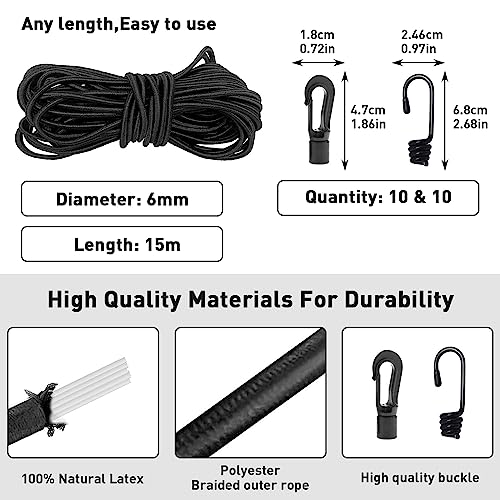 Corde Elastiche con Gancio 6mm*15m Nero,Elastici con Ganci,DIY Corda Elastica,Tenditore Bagagli per Auto,Bicicletta Elastic Expander Corda di Gomma Telone Tensione Corda con Gancio Accessori