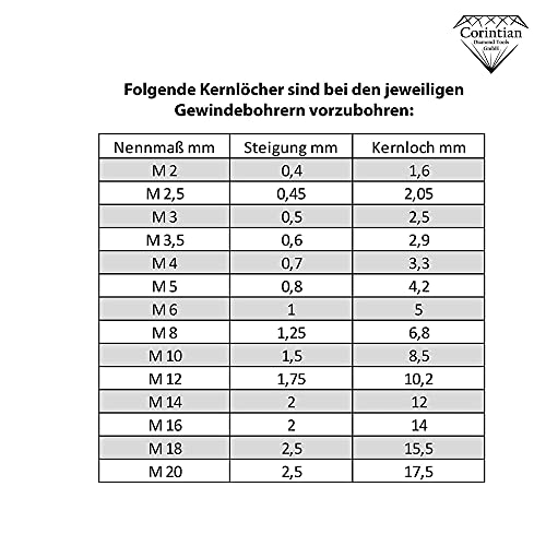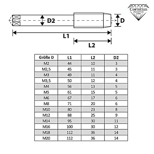 Adatto per: la punta per filettatura Corintian si applica su acciaio normale, acciaio inossidabile, leghe, ghisa e ghisa grigia, titanio e leghe di metallo, ottone e rame. Adatto per materiali fino a 900 N/mm², acciaio basso legato e non legato.