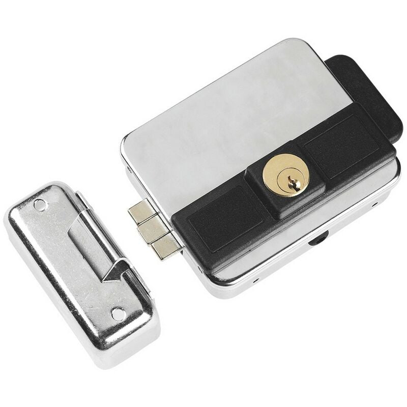 Tipo reversibile. con scrocco autobloccante, incontro regolabile in altezza. interassi dei fori di fissaggio unificati, apertura tramite chiave e mediante impulso elettrico a basso voltaggio. scatola in acciaio, alimentazione elettrica 8-12v. bocchetta in