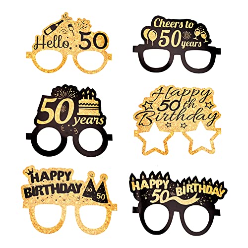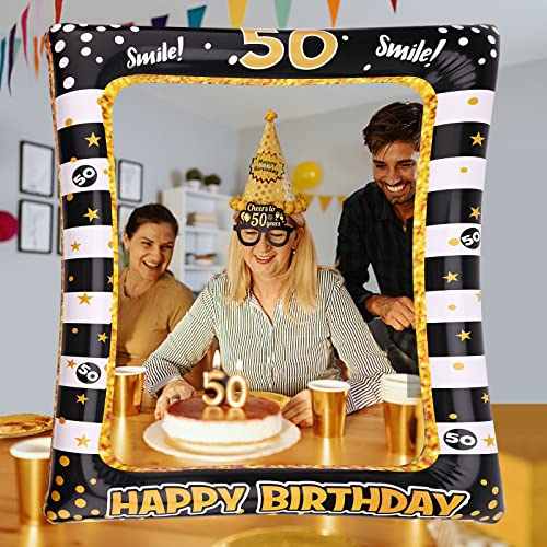 Cornice portafoto per 50 anni e 6 occhiali di carta, accessori per cornice portafoto compleanno 50 anni cornice selfie gonfiabile, cornice per foto in oro nero, decorazioni per feste di compleanno per