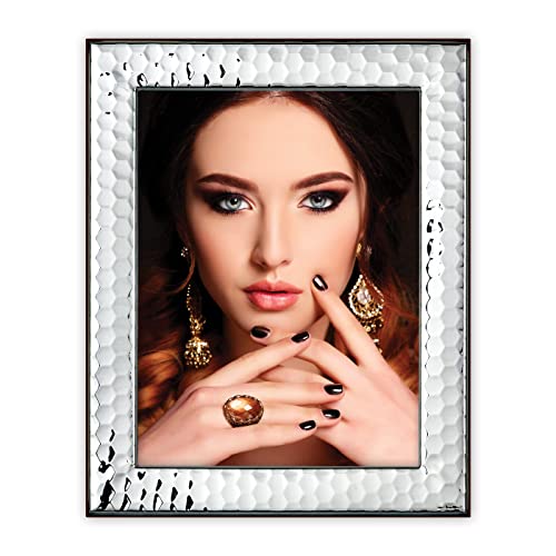 Cornice in metallo, prodotta in Italia, con finitura silver plated lucida, profilo decorato a rilievo, effetto elegante, retro in legno, da tavolo, disponibile in vari formati, ideale per celebrare anniversari o compleanni, adatta per regali preziosi o importanti.