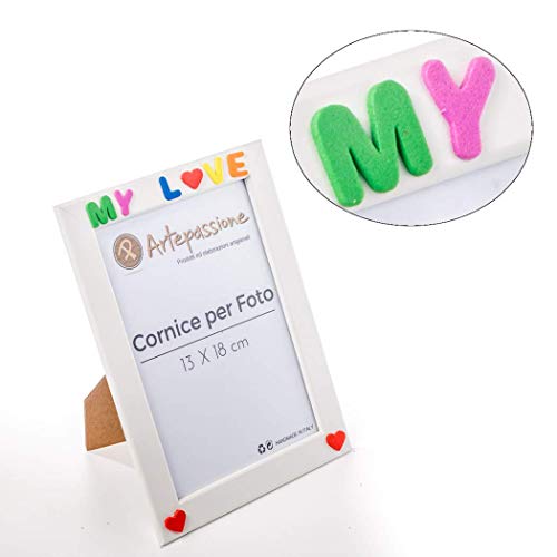 Cornici per Foto in Legno con la Scritta My Love e Decorata con Cuoricini, da Appoggiare o Appendere, Misura 13x18 cm Bianca. Ideale come Regalo e Ricordo di San Valentino