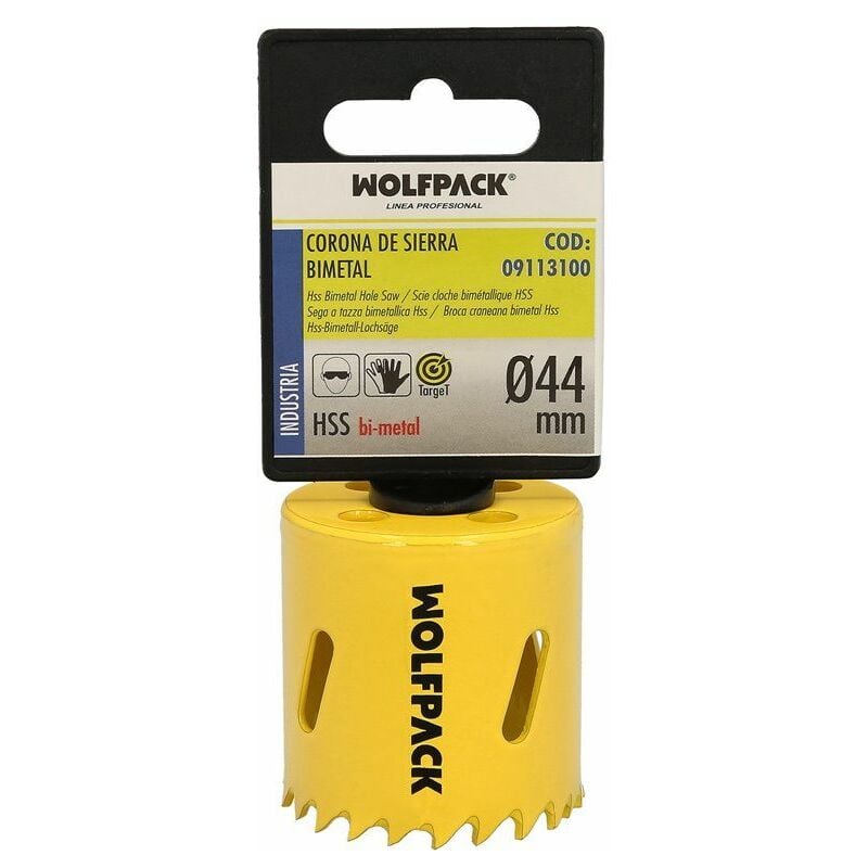 Corona bimetallica Target Saw - Dimensioni: Ø 44 mm. - Realizzata in una lega con elevata durezza e resistenza all'usura. - Denti temprati termicamente, che gli conferiscono un'elevata stabilità ai taglienti. - Base della corona rinforzata. - Fori laterali per l'evacuazione del truciolo e un migliore raffreddamento. - Ideale per realizzare fori su acciaio dolce, acciaio inossidabile, ghisa, ottone, alluminio e legno. />- Articolo noto come trapano per legno, trapano per legno, sega per legno, sega per legno.