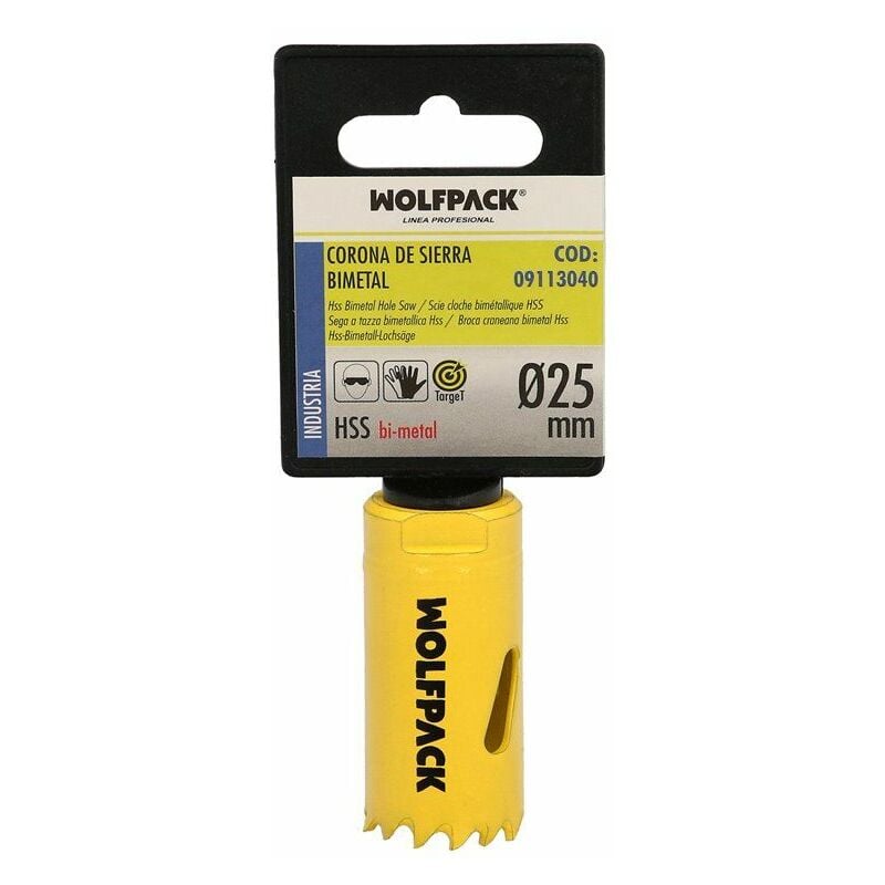 Corona bimetallica Target Saw - Dimensioni: Ø 25 mm. - Realizzata in una lega con elevata durezza e resistenza all'usura. - Denti temprati termicamente, che gli conferiscono un'elevata stabilità ai taglienti. - Base della corona rinforzata. - Fori laterali per l'evacuazione del truciolo e un migliore raffreddamento. - Ideale per realizzare fori su acciaio dolce, ghisa, ottone, alluminio e legno. - Articolo noto come trapano per legno, trapano per legno, sega per legno, sega per legno.