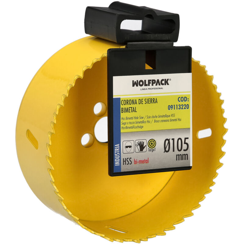 Corona bimetallica Target Saw - Misura: Ø 105 mm. - Realizzata in una lega di elevata durezza e resistenza all'usura. - Denti temprati termicamente, che gli conferiscono un'elevata stabilità ai taglienti. - Base della corona rinforzata. - Fori laterali per l'evacuazione del truciolo e un migliore raffreddamento. - Ideale per realizzare fori su acciaio dolce, ghisa, ottone, alluminio e legno. - Articolo noto come trapano per legno, trapano per legno, sega per legno, sega per legno.