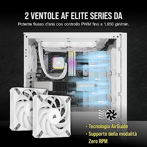 Prestazioni di raffreddamento all'avanguardia: Ottimizza le prestazioni della CPU con il raffreddamento a liquido azionato da due ventole CORSAIR AF ELITE Series AirGuide da 120 mm con controllo PWM, che fornisce un potente flusso d'aria compreso tra 450 e 1.850 giri/min.