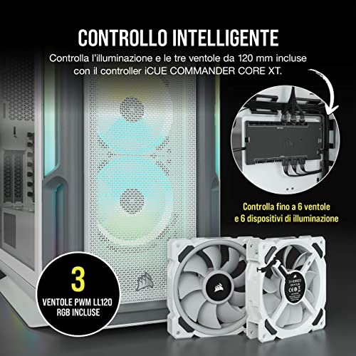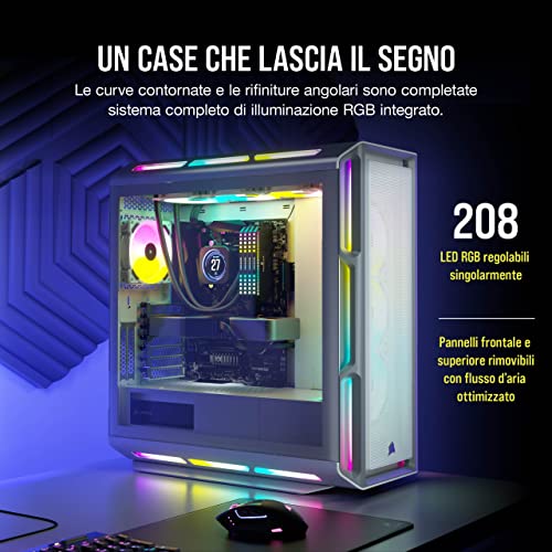 Corsair iCUE 5000T RGB, case Mid Tower ATX, 208 LED RGB gestibili singolarmente, spazio per più radiatori da 360mm, cablaggi facilitati, 3 ventole LL120 RGB e Commander CORE XT inclusi, bianco