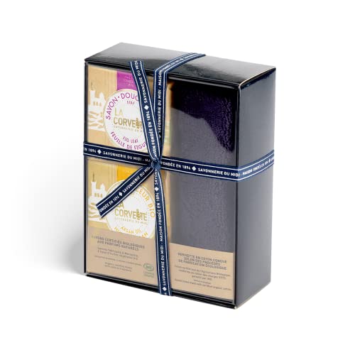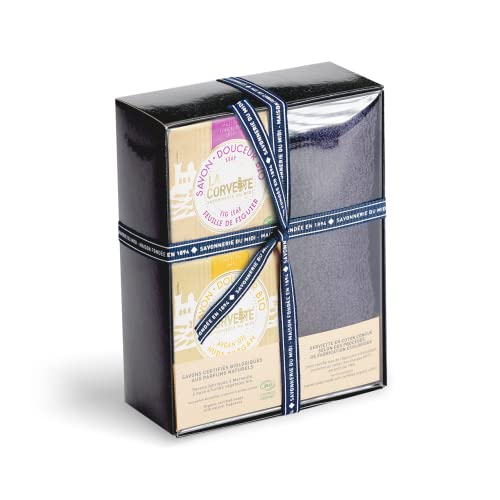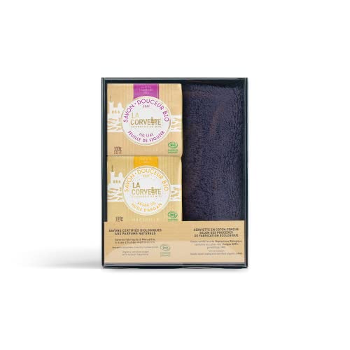 Questo set comprende 2 saponi Douceur Bio, certificati Cosmos Organic, così come un asciugamano progettato secondo processi di fabbricazione ecologici