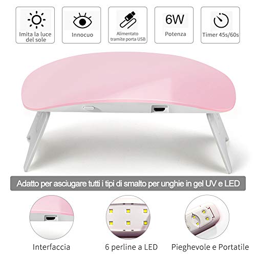 Lampada UV/LED 6W: Adatto per asciugare tutti i tipi di smalto semipermanente. Premi il pulsante, tempo predefinito 45s, lo premi per 2 secondi, il tempo diventa 60s. Stile compatto, design pieghevole, facile da portare.