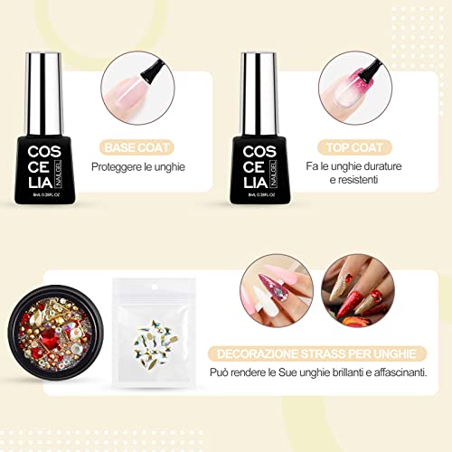 UN KIT MERAVIGLIOSO PER GLI AMANTI DELLA MANICURE: Il kit semipermanente unghie completo di COSCELIA contiene tutti gli strumenti e articoli per manicure, contiene 110W unghia lampada LED+UV, 8pz smalti semipermanenti cambiano colore gel con la base coat e il top coat, gli strass decorazione e gli strumenti per manicure. Si può realizzare la manicure DIY con la Sua famiglia e i Suoi amici a casa.