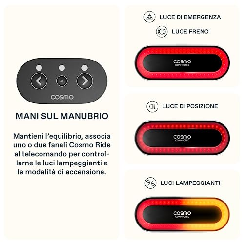 MANTIENI I TUOI CARI INFORMATI E MONITORA LA TUA PERFORMANCE: condividi i tuoi itinerari in tempo reale con i tuoi cari, per non essere mai solo. In caso di caduta, la luce posteriore connessa rileva la situazione e invia automaticamente un SMS per avvertire fino a 3 tuoi contatti. Grazie all'app Cosmo Connected (compatibile con iOS e Android), puoi inoltre registrare i dati dei tuoi tragitti (percorso, durata, distanza) e condividerli con chi ti aspetta a casa.