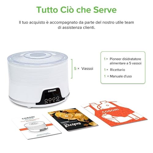 COSORI Essiccatore Alimentare, Essiccatore Multiuso per Frutta e Verdura, con 5 Vassoi Impilabili e Rimovibili, Altezza Regolabile, Temperatura Regolabile 35-75°C, Senza BPA, 350W