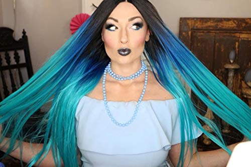 Cosswigs Blue Lace Front Wigs Ombre 3 Tone Black Roots Heat Resistant Synthetic Hair Lace Wig for Halloween 24inches