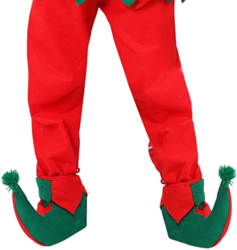 Questo costume completo da 5 pezzi è composto da un top verde con dettagli rossi, un paio di pantaloni rossi, una cintura nera con fibbia dorata, un cappello da elfo con orecchie attaccate e un paio di stivali da elfo / copriscarpe