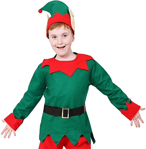 Costume da Elfo per Bambini - Vestito da Elfi con Top Verde, Pantaloni Rossi, Cappello da Elfo con Orecchie attaccate, Cintura e Stivali (X-Grande)
